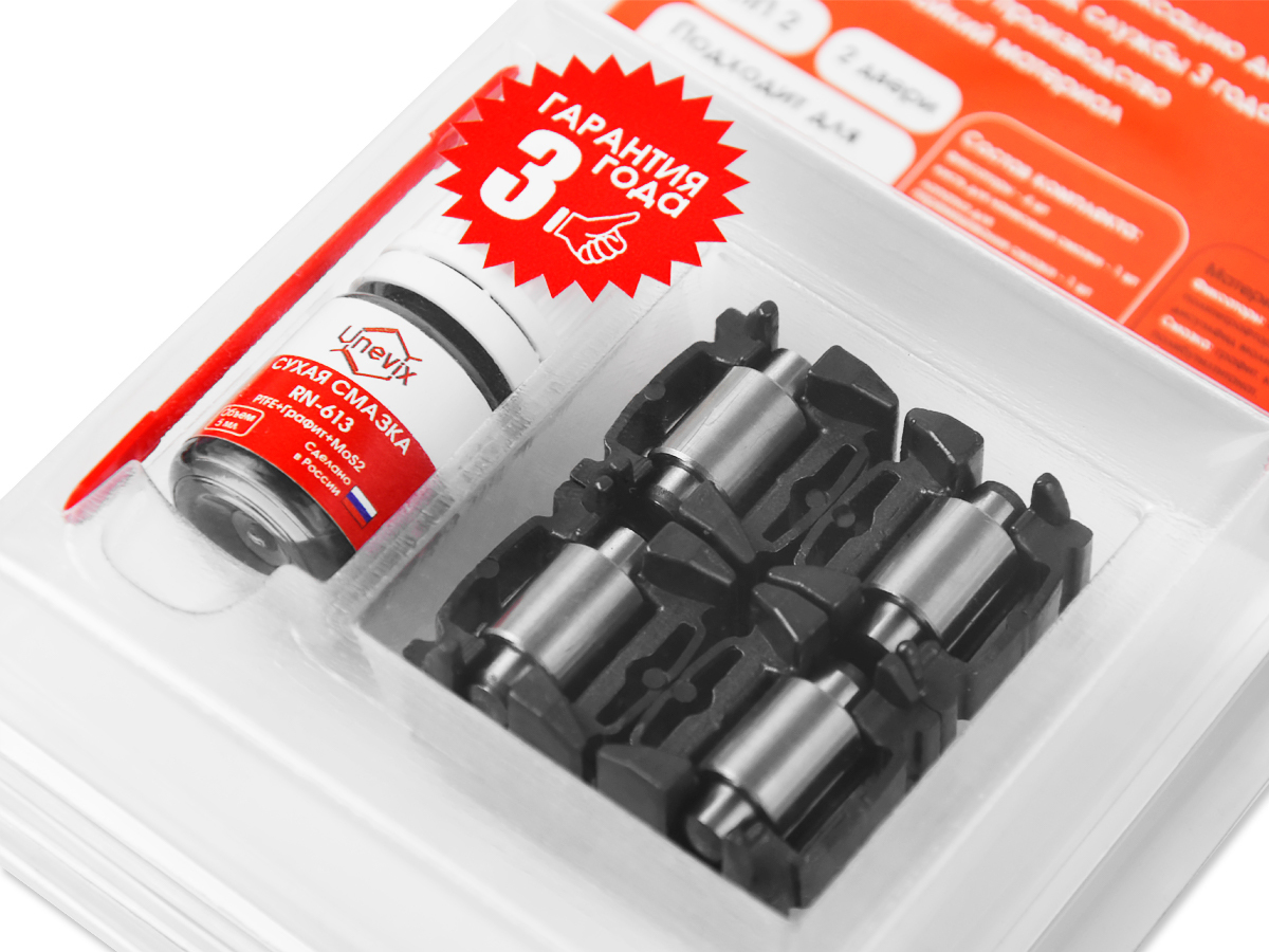 Материал фиксаторов - полиамид 6, наполненный графитом, дисульфидом молибдена и фторопластом. Это разработанный нами состав, который лучше всех показал себя на испытаниях. Графит, дисульфид молибдена и фторопласт в составе материала играют роль сухой смазки. За счет этого фиксаторы служат дольше.
