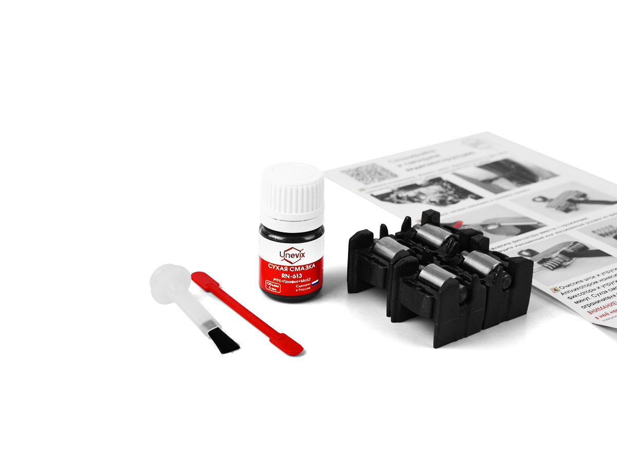 Материал фиксаторов - полиамид 6, наполненный графитом, дисульфидом молибдена и фторопластом. Это разработанный нами состав, который лучше всех показал себя на испытаниях. Графит, дисульфид молибдена и фторопласт в составе материала играют роль сухой смазки. За счет этого фиксаторы служат дольше.