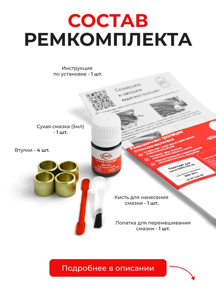 Ремкомплект рассчитан на ремонт одной трапеции стеклоочистителя - по две втулки на каждый рычаг.
