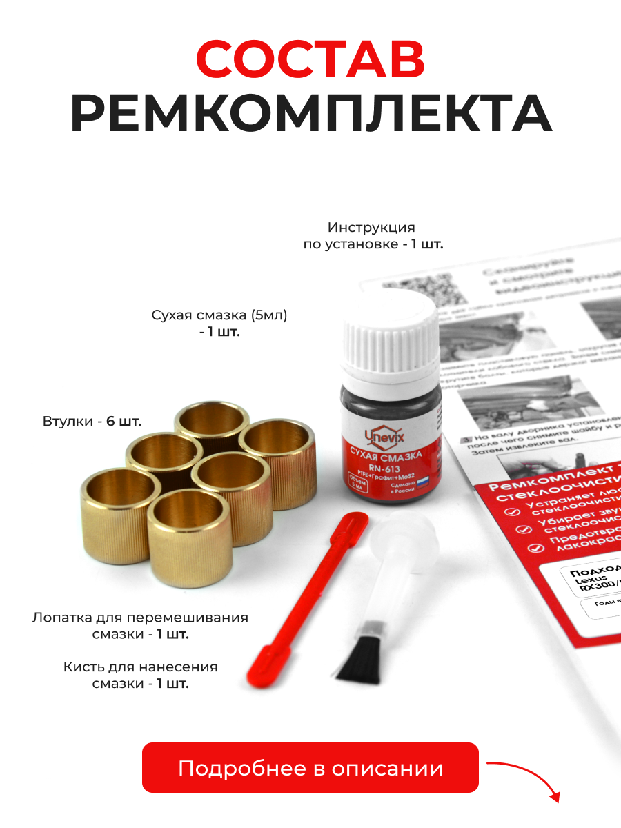 Ремкомплект расчитан на ремонт одной трапеции стеклоочистителя - по две втулки на каждый рычаг.